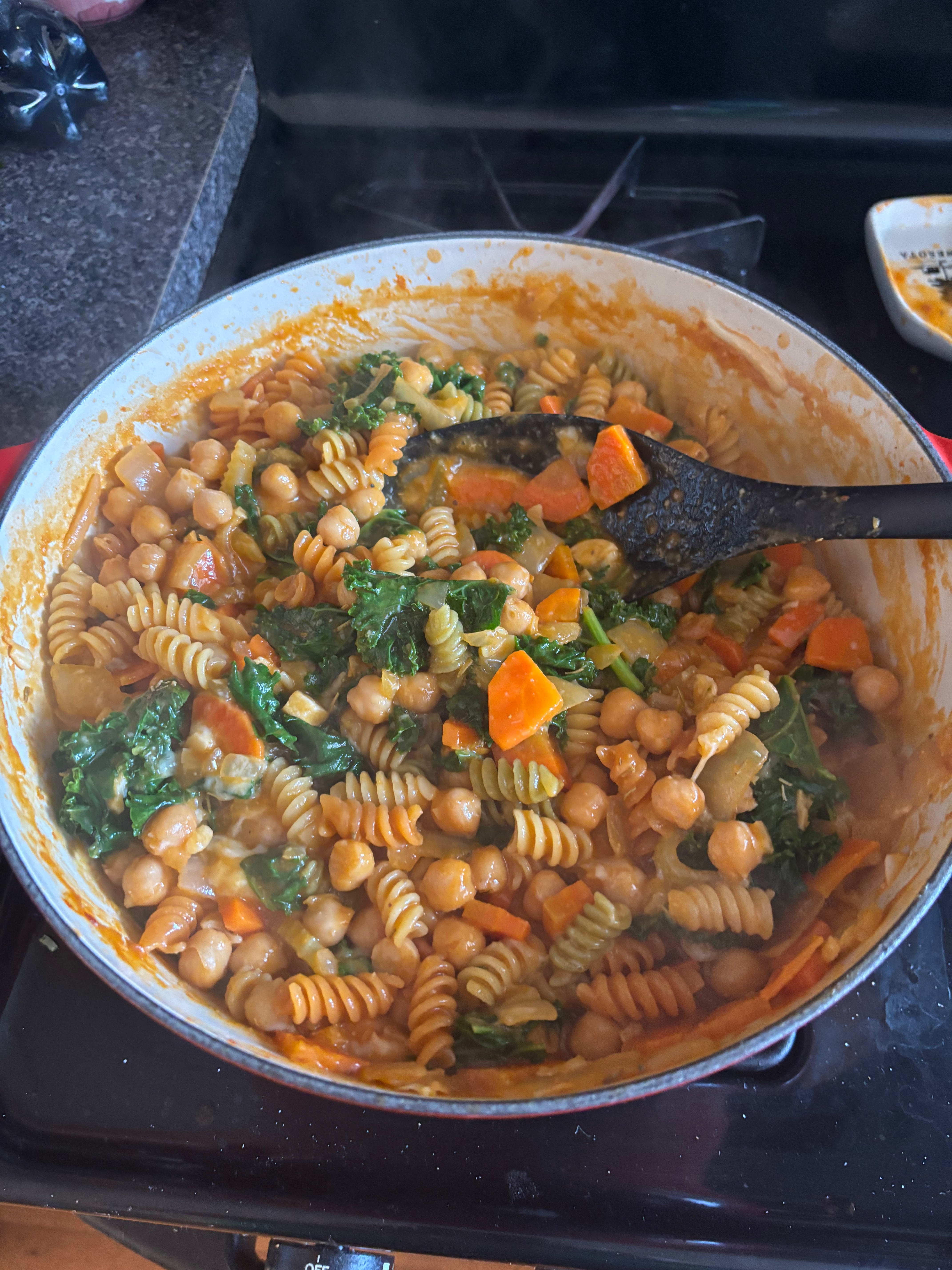 Add the stock, beans, and that bean puree water from the beginning, and bring to a boil for five minutes, then add your pasta and cook according to the package directions. As it cooks, you can taste the sauce for seasoning (it’ll probably need salt) and you can toss in the kale so it wilts.